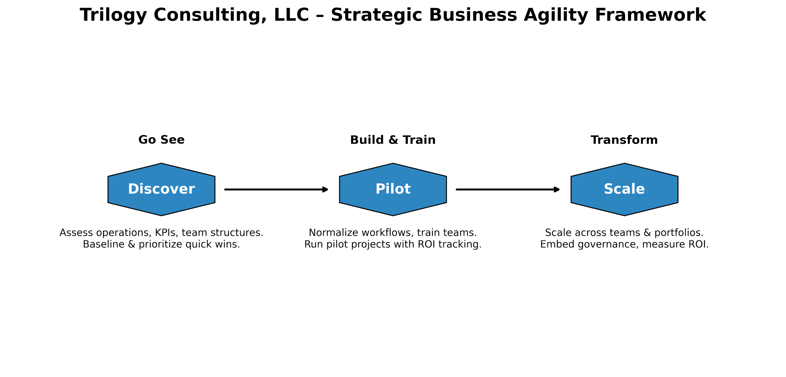 At Trilogy Consulting, LLC, we guide organizations through a proven 3-Phase Framework designed to reduce risk, prove value, and scale transformation with confidence.
